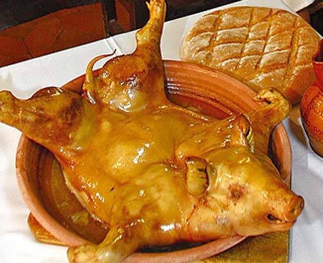 Cordero y cochinillo asado, patatas revolconas, chuletón de Ávila, judiones de la Granja, ponche segoviano, yemas de Santa Teresa .